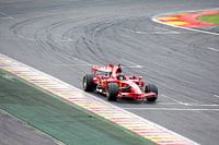 De Ferrari F1 bolide van 2008, waarmee Kimi Räikkönen en Felipe Massa meededen in het wereldkampioenschap, op circuit Spa Francorchaps. Deze auto won uiteindelijk het constructeurs kampioenschap.
