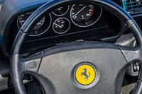 Dashboard van een Ferrari F355 sportwagen uit de jaren '90. De auto is voorzien van een zwart lederen interieur en chromen details op de wijzerplaten.