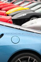 Ferrari collectie met een Ferrari 430 Scuderia in de voorgrond. De 430 Scuderia is een lichtgewicht en krachtigere versie van de Ferrari F430. Op de achtergrond staan andere Ferrari's geparkeerd, waaronder een 360 Modena, 550 Maranello en 458 Italia.