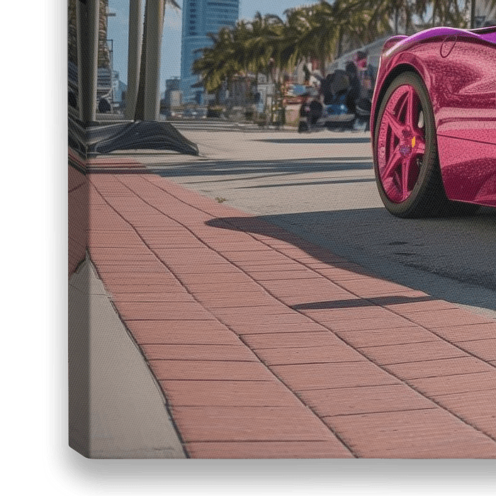 "Miami Sparkle" vangt de essentie van luxe en stijl, met een glinsterende Ferrari 458 Italia in een opvallende roze metallic glitterlak die schittert in het zonlicht. Het iconische ontwerp van de Ferrari wordt versterkt door de speelse, gedurfde kleurkeuze, die het voertuig een unieke en opvallende uitstraling geeft. De setting van de…