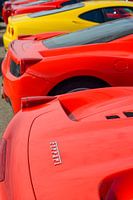 Ferrari 458 Italia, Ferrari 458 Spider en Ferrari 360 Modena in de Paddock van het circuit van Zandvoort. Detailshot van de achterkant van de auto's.