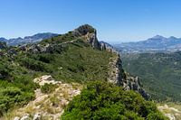Uitzicht op het weidse berglandschap met groene hellingen. Een strakblauwe lucht ontmoet grillige rotsformaties. De bergkam van de Sierra del Ferrer is ruig en heeft een complexe vorm. Alleen een ongedefinieerd pad leidt over de bergkam. In de verte is de top van Puig Campana zichtbaar. De bergen rijzen majestueus op nabij de Middellandse Zeekust. Wandelavonturen op een warme en zonnige zomerdag.