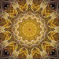 Dit digitale kunstwerk, met elkaar overlappende twaalfpuntige sterren in stemmige herfstkleuren, begon zijn leven als een foto. Om precies te zijn: een foto van drijvende bladeren (in het Frans: feuilles flottantes) in een vijver. Door die foto in twaalf transparante lagen, ieder dertig graden geroteerd ten opzichte van de onderliggende, te stapelen, ontstond dit beeld. Klinkt nog heel ingewikkeld, ik geef het toe maar het resultaat telt: een intrigerende compositie die je als het ware het kunstwerk in trekt.