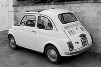 Oude Fiat 500 oldtimer auto staat geparkeerd in een steegje in Italiaans dorp Alberobello, Apulië, Italië. Zwart wit. Automerk Fiat cinquecento. Dolce vita. Nostalgie. Vintage klassieker.