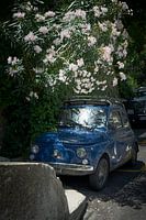 Fiat 500 bedolven door Oleander. Mooi oud fiatje 500 in de straten van Positano Italie. Stadsgezicht in Positano. Typisch italiaanse oude auto. Parkeren op zijn italiaans