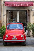 Fiat 500 in het oude centrum van Pitigliano in het zuiden van Toscane voor een antiekzaak.