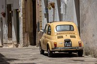 In Puglia in Specchia stond deze gele klassieke Fiat 500 geparkeerd.