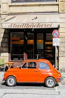 Fiat 500 klassieke Italiaanse compacte stadsauto geparkeerd aan de kant van de straat in de stad Hamburg voor een bakkerij.