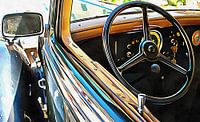 Kijkend door het bestuurdersraam van een Fiat 508 Balila, een klassieke Italiaanse auto. Let op het gebrek aan comfort en het eenvoudige stuurwiel. De Fiat Balila was een compacte auto ontwikkeld door Fiat in 1932. Hij werd geproduceerd tussen 1932 en 1937.