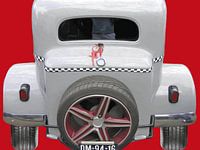 Het oog valt op het grote achterwiel, prominent als een rad van de tijd. De velg, rood en hoekig, ademt snelheid en kracht, maar de stilstaande houding suggereert een pauze in de eeuwige reis. De zwart-witte schaakrand, die de contouren van de auto volgt, fungeert als grens tussen verleden en heden; alsof elk blokje een herinnering is, vastgelegd in ritme en herhaling.