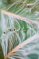 Een enorme macro close up van de vezels van een uitgebloeide plant met daarin nog de zaden. Dit beeld geeft door de onwerkelijke vergroting bijna een abstracte uitstraling.