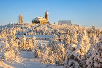 Het plateau van de Fichtelberg met het weerstation, het hotel en het gondelstation schittert in het gouden licht van de opkomende zon. De lucht is onbewolkt en prachtig blauw. Het besneeuwde landschap omringt het plateau.
