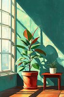 Een sereen interieurbeeld van een statige rubberboom in een terracotta pot, badend in warm ochtendlicht dat door een hoog raam naar binnen valt. De groene muur en de geometrische schaduwen van het raamkozijn creëren samen met de plant een harmonieus spel van licht en schaduw, terwijl een klein bijplantje op een rood bijzettafeltje het geheel completeert.