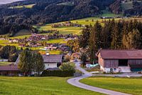 Stemmingsvol gouden avondlicht in de plaats Fieberbrunn in Oostenrijkse Alpen (Tirol).