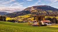 Stemmingsvol gouden avondlicht in de plaats Fieberbrunn in Oostenrijkse Alpen (Tirol).