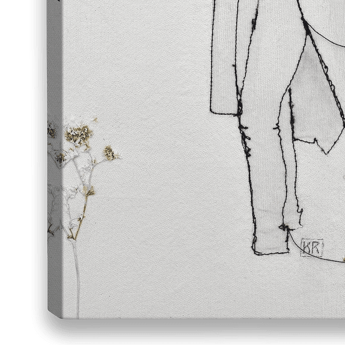 'Field Of Flowers', een figuratief schilderij van zwart draad en bloemen op doek. Een meisje afgebeeld zonder armen turend in de toekomst & voetloos in een bloemenveld. De losse draden achter haar staan voor groei, beweging & verandering.