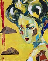 Abstract en kleurrijk portret van een Geisha waarvan het origineel gemaakt is met olieverf op canvas met stukjes bedrukt papier.