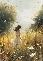 Een vrouw staat in een veld, omringd door een overvloed aan bloemen, haar blik rustend op hun delicate schoonheid. Het zachte daglicht omhult de scène, waardoor de neutrale tinten van het landschap worden verlicht en een serene sfeer ontstaat. De omgeving ademt een heldere, luchtige atmosfeer uit, die de rust en vredigheid van het moment benadrukt.