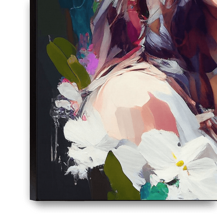 Portret van een prachtige vrouw met zwart lang haar en witte bloemen in het haar. Idillisch, in een groene omgeving met prachtige bloemen. Passend bij diverse trends en stijlen. Er is gebruik gemaakt van fine art in combinatie met palletmes.