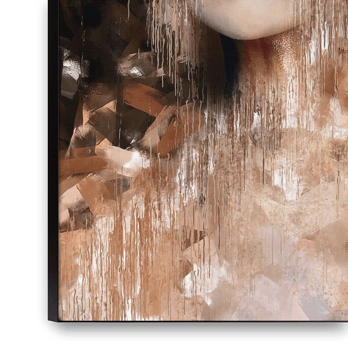Abstract impressionistisch portret van een vrouw met grove penseelstreken op canvas in bruin, koper en goud tinten.