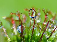 Een kleurig natuurlijk feestje! Klis met dauwdruppeltjes belicht door de zon. Hierdoor ontstaan mooie schitteringen en een prachtig bokeh in de achtergrond. Een fijn overwegend groen natuurlijk beeld met kleurrijke accenten. Macrofotografie op haar best!