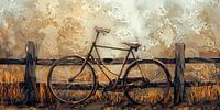 Dit kunstwerk beeldt een sereen en ietwat melancholisch tafereel uit van een klassieke fiets die tegen een verweerd houten hek leunt.