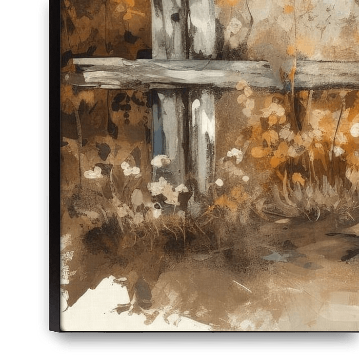 Het kunstwerk illustreert een serene scène waarin een fiets met een mandje rust tegen een oud, houten hek, omgeven door een uitbundige bloei van wilde bloemen.