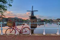 Zonsopkomst bij de Haarlemse Bloemenfiets (Haarlem Flower Bike), met in de achtergrond rivier het Spaarne en molen De Adriaan.