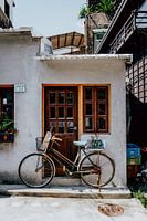 Een verrassend plaatje in Tainan: voor dit kleine huisje staat een fiets met mandje tegen de gevel. Foto gemaakt in Tainan, gelegen aan de westkust van Taiwan.