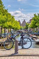 Een fiets staat geparkeerd op de Begijnebrug in het centrum van Haarlem in Nederland. Op de achtergrond staat een rij met traditionele Hollandse huizen.