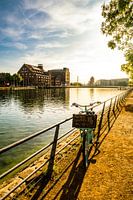 Koop de foto Fiets op de reling bij de binnenhaven Duisburg Ruhrgebied Duitsland van Dieter Walther als print op canvas, aluminium dibond, (ingelijste) fotoprint, behang en ArtFrame. Voor jou op maat geprint in Fine-Art kwaliteit.