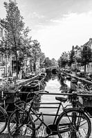 Zwart-wit foto Oude fiets op een brug aan een gracht met typische grachtenpanden in de grachtenbuurt in de oude stad van Amsterdam, Nederland.