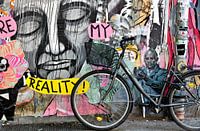 Fiets zonder zadel tegen muur met graffiti. Op de muur is een man met machinegeweer te zien, masker en kreet "My Reality"