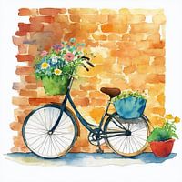 Een Nederlandse fiets leunt tegen een rode bakstenen muur. Er zitten verse bloemen in de fietsmand.