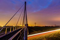Fietsbrug tussen Hitsum en Franeker na zonsondergang. Door de lange sluitertijd kleurt de lucht prachtig blauw en magenta, tevens laat het verkeer mooie rode en witten strepen na in de foto.