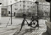 Fiets geparkeerd bij een poort naar een achtertuin in de Nikolai-wijk in Berlin-Mitte in zwart-wit
