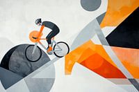 Te midden van een energiek kleurenspel beweegt een fietser zich dynamisch en elegant over een geometrisch pad. De felle sinaasappels en diepe grijstinten creëren spanning terwijl de fietser schijnbaar gewichtloos over de geabstraheerde vormen glijdt. Een hedendaags meesterwerk dat de polsslag van beweging en de opwinding van snelheid vastlegt.