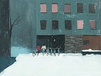 Hollandser kan het haast niet: een rij fietsen tegen een gebouw, met een serene winterse deken van sneeuw. Wat dit werk zo bijzonder maakt, is niet alleen het tafereel zelf, maar ook de unieke schilderachtige stijl waarmee het tot leven komt. Dit digitale…