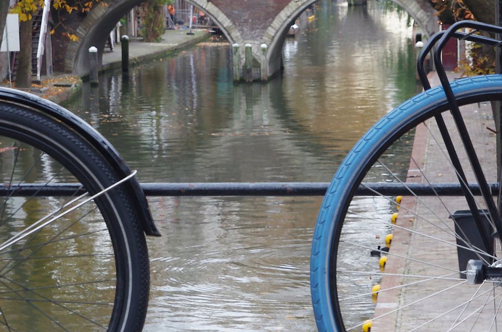 Foto van twee geparkeerde fietsen op een van de bruggen over de Oudegracht in Utrecht, met op de achtergrond de bogen van de Hamburgerbrug