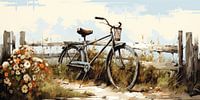Het tafereel speelt zich af tegen een achtergrond van een heldere, blauwe lucht met zachte, witte wolken, wat de indruk wekt van een perfecte lentedag. De fiets zelf, met zijn klassieke ontwerp en mandje aan het stuur, staat centraal in de compositie, symboliserend de eenvoudige genoegens van het leven. De bloemen in tinten van wit, oranje en geel, brengen leven en kleur in het kunstwerk, en creëren een contrast met het verweerde hout van het hek en het metaal van de fiets. Het geheel is geschilderd met brede, expressieve penseelstreken die zowel de textuur van de natuurlijke elementen als de sfeer van warmte en rust benadrukken.