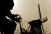 Fietser passeert windmolen De Vriendschap in Weesp, waar rietdekkers net met een nieuw dak bezig zijn