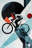In een dynamische compositie van geometrische vormen en gedurfde kleuren ontvouwt zich de energie van een fietser terwijl hij met het sprankelende momentum van beweging voorwaarts de vrijheid in stormt. Duisternis en licht harmoniëren in een spannende dialoog, terwijl het gestileerde silhouet de kijker boeit met zijn krachtige voorwaartse stuwkracht.