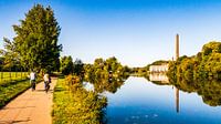 Fietser met reflectie Centrale aan de Ruhr in het Ruhrgebied