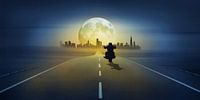 Het silhouet van een motorrijder op een lange rechte weg en een skyline aan de horizon. Nachtelijke straatbeeld met gloeiende volle maan. Een afbeelding van fietsers en USA fans.