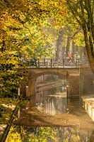 Fietser in de herfst over de Quintynsbrug, Nieuwe Gracht, Utrecht, Nederland
