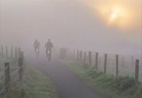 Twee eenzame fietsers in de ochtendmist, in Hollands landschap