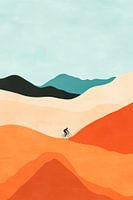 Een uitgestrekt landschap ontvouwt zich in een zachte kleurenzee van warme aardetinten en harmonieuze blauw- en groentinten. De actieradius van een fietser vormt een dynamisch contrast met de zachte, glooiende heuvels. De lucht is rustig blauw en nodigt uit tot nieuwe avonturen in deze schilderachtige omgeving.