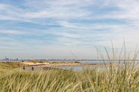 Fietsers langs de Westerschelde op Zeeuws-Vlaanderen ter hoogte van Breskens. In de achtergrond is Vlissingen te zien