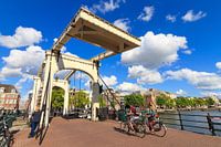 Prachtige opname van de iconische Magere brug over de rivier de Amstel in Amsterdam met fietsers en een blauwe lucht met wolken in de zomer
