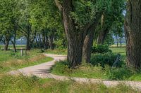 Een slingerend fietspad langs bomen met een zomers volgroeid bladerdak en een groene dominerende kleur in het noorden van de provincie Friesland.